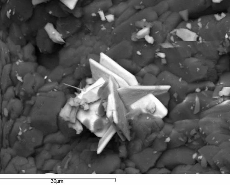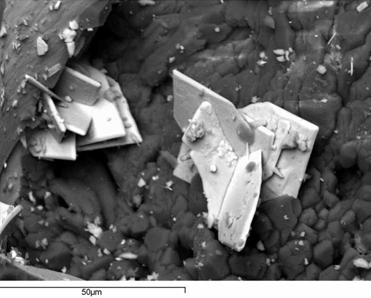 Descloizita, Mina Perdiguera. Típico agregado de cristales tabulares. De visu son muy brillantes y de color rojo anaranjado a pardo rojizo. Foto SEM (electrones secundarios). |