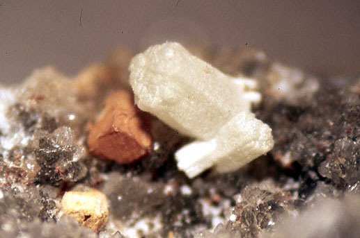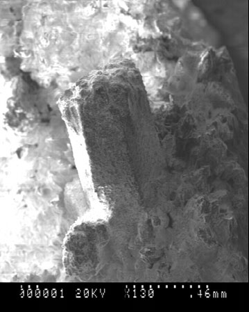 Descloizita. Mina Perdiguera, Madridejos (Toledo). Esta muestra, un agregado de dos cristales pseudohexagonales de color blanco verdoso y tamaño milimétrico es la única descloizita hallada en Madridejos cuya composición se ajusta a la teórica para la especie. En principio fue confundida con piromorfita o vanadinita. Foto SEM: Luis Jordá. |