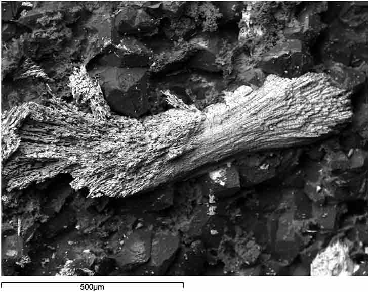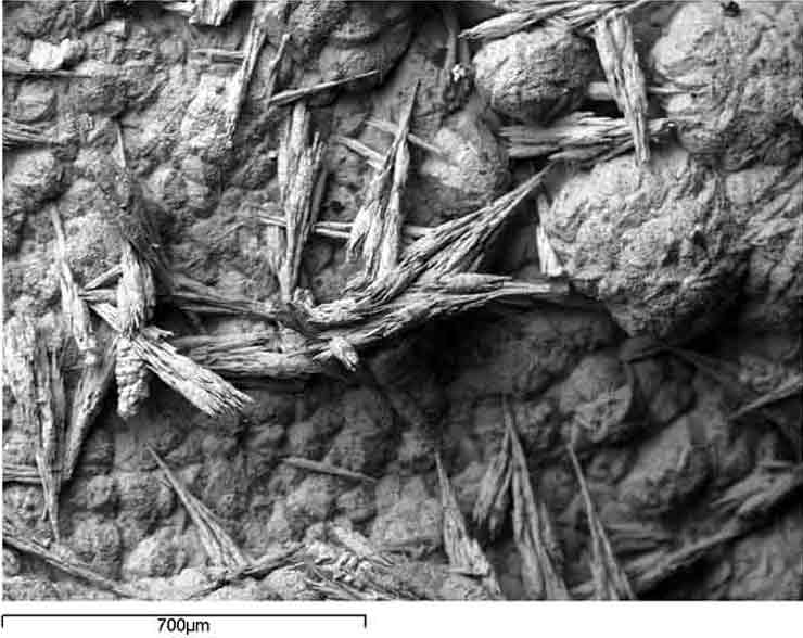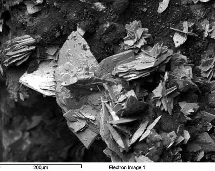 Descloizita, Mina Perdiguera. Típico agregado de cristales tabulares. Este es el habito mas abundante para la descloizita en Madridejos y el que constituye un termino intermedio descloizita-arsendescloizita. Foto SEM (electrones secundarios). |