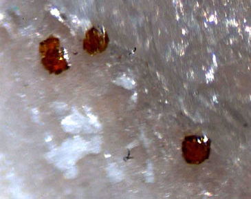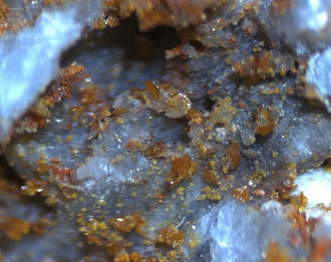 Descloizita La descloizita es un vanadato de plomo con cantidades variables de zinc y cobre. Forma parte de un grupo de vanadatos ortorrómbicos de plomo con anión hidroxilo y que se diferencian en el contenido de otros metales (grupo de la descloizita): Descloizita: zinc (cobre inexistente o minoritario) Mottramita: cobre (zinc inexistente o minoritario) Cechita: hierro y manganeso Pirobelonita: manganeso Arsendescloizita: análogo arsenical de la descloizita La descloizita es el término más abundante del grupo y, a pesar de ser un mineral raro, se ha utilizado ocasionalmente como mena de vanadio. Fue descubierta en el año 1854 en la Sierra de Córdoba (Argentina). En España, Calderón la citó en el yacimiento de Santa Marta (Badajoz). Se ha hallado también junto con mottramita en las minas de Albuñuelas (Granada). En las minas de Madridejos la descloizita es un secundario frecuente, aunque normalmente no se encuentra en gran cantidad. Se encuentra en forma de agregados de cristales tabulares brillantes que muy raramente superan el milímetro, aunque pueden hallarse cristales de hasta 2 mm. Presenta color anaranjado, rojo granate o pardo rojizo que destaca sobre la barita, que constituye la matriz habitual de este mineral, o sobre la mimetita a la que normalmente acompaña. Su composición se aleja de la teórica para la especie, con el zinc como metal mayoritario y con un contenido elevado de cobre y arseniato, anion que le convierte en un término intermedio entre la descloizita y la arsendescloizita. Se trata pues de un arseniato-vanadato de zinc, plomo y cobre con un contenido inusualmente bajo de anión hidroxilo y con zinc como metal mayoritario en lugar del plomo. Analíticamente, podríamos asignarle la composición Zn (Pb,Cu) (AsO4)(VO4). Es posible hallar en el yacimiento cristales de simetría pseudohexagonal y color blanco o blanco verdoso que en un principio se confundieron con piromorfita y que sin embargo presentan una composición mucho mas ajustada a la descloizita teórica, sin contenido de cobre y arsénico, aunque son mucho más raros. ![]() Descloizita (20x). Estos cristales son más ajustados a la composición teórica de la especie que los habituales cristales prismáticos de color rojo o anaranjado de arsenovanadato de zinc, plomo y cobre. (Colección y microfoto: C. Menor). |