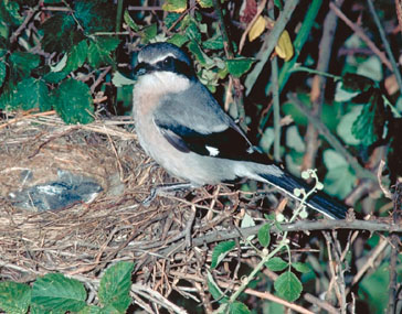 Presenta las partes superiores del cuerpo de color gris-pizarra, las inferiores blancas o rosadas con una lista superficial blanca, bandas negras sobre los ojos y las mejillas, las alas negras con una estrecha franja blanca y la cola larga. Los jóvenes son pardo-grisáceo por encima con bandas ondeadas pardas por debajo, y ambos sexos son externamente iguales. Elige los huertos de frutales, los campos abiertos con matorrales y las vegas de ríos con cultivos cercanos. Durante todo el año suele observársele en solitario, habitualmente posado en cables de teléfono, desde donde se lanza a capturar pequeñas aves, lagartijas o insectos. También utiliza como posadero las partes más altas de arbustos, preferiblemente secos. Su nido está construido de forma elemental, forrado con hierbas, raicillas y algunas plumas, y puede situarlo a alturas que oscilan entre el metro y medio y los veinte metros. La puesta se realiza a primeros de abril y consta de cinco o seis huevos. |