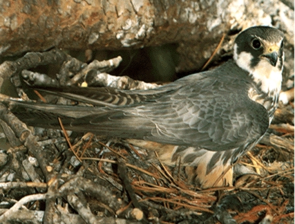 De adulto posee el píleo gris oscuro y los lados de la cara negros con fina bigotera del mismo color. El vientre, los muslos y las infracobertoras caudales son de color castaño rojizo, la espalda y los hombros gris pizarra, y el pecho y los flancos blancos con estriado en oscuro. El joven es similar, pero algo más pardo y sin el castaño de muslos e infracobertoras que son claros. Se sitúa en bosques de todo tipo, y en terrenos arbolados con alternancia de claros. Es una rapaz habilidosa para la caza en el aire, ya que puede capturar a su presa tanto en velocísimo "picado" como partiendo de un posadero en vuelo planeado. Esto le permite cazar aláudidos y golondrinas o vencejos, a pesar de la maniobrabilidad y velocidad que alcanzan estas aves en vuelo. Puede agruparse en pequeños bandos que se dedican a capturar insectos voladores al atardecer. Es también frecuente encontrarles en la línea de fuego de rastrojos a la caza de los pequeños animales que huyen aterrorizados. |