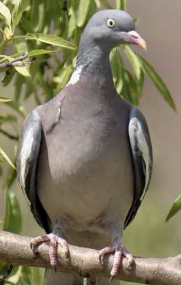 Es la mayor de las especies de palomas europeas. la cabeza, el cuello y la cola son grises y, cuando es adulto, presenta una mancha blanca, morada y verde a ambos lados el cuello; el pecho es gris-vinoso y la franja alar blanca. Ambos sexos son externamente iguales, si bien el macho es algo más corpulento. Fundamentalmente habita en encinares y bosques caducifolios, si bien ocasionalmente ocupa pinares no muy espesos y sotos de ríos con vegetación arbustiva. Durante la parada nupcial y la incubación es un ave muy ruidosa. escuchándose desde varios cientos de metros el arrullo del macho. También el batido de sus alas, potente y rápido, es fácilmente audible. Para instalar su nido construye una plataforma muy elemental de ramitas finas entrelazadas. Normalmente pone dos huevos y, como es muy confiada, abandona frecuentemente los nidos descubiertos durante el periodo de incubación. |